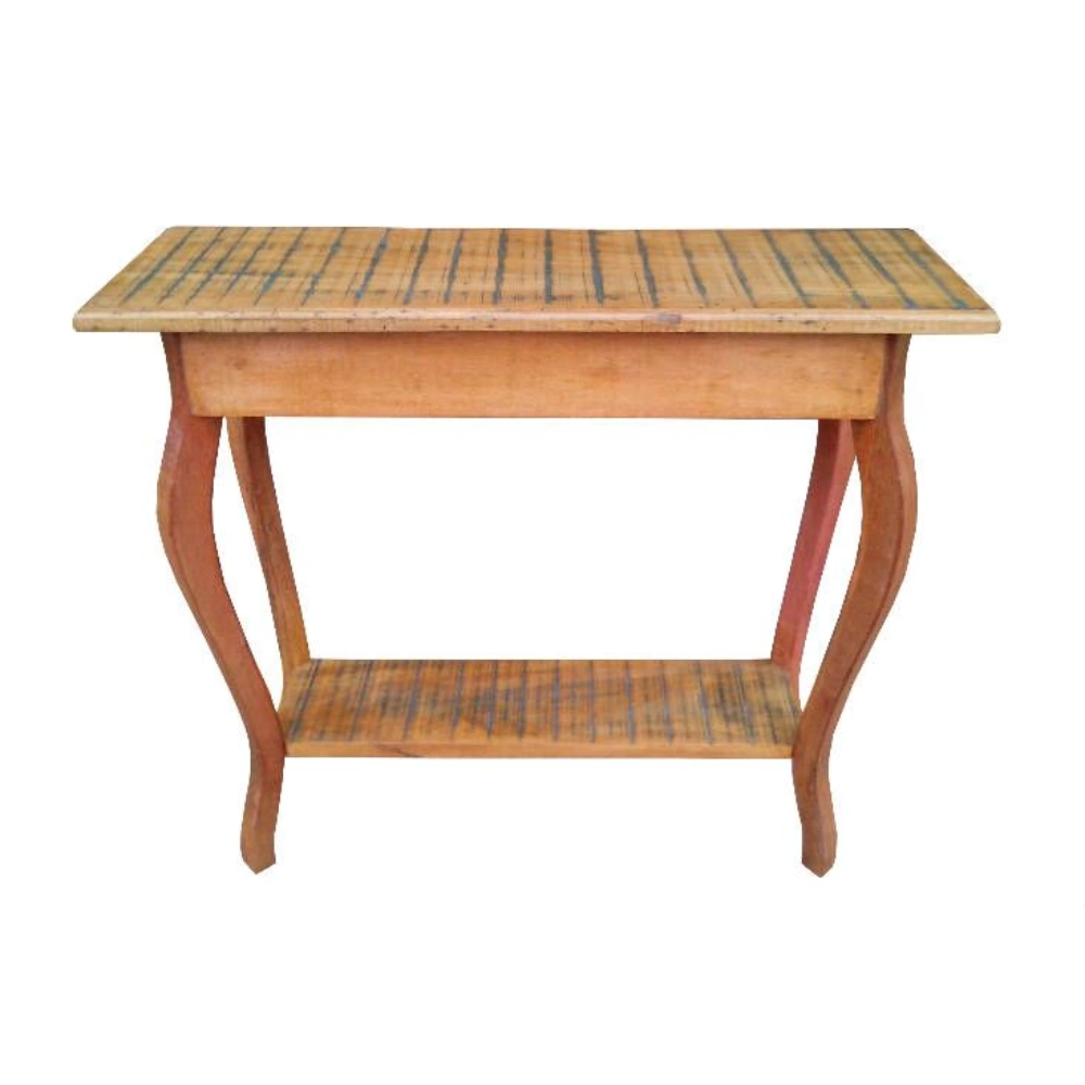 Contando com quatro pés muito bem desenhados de forma arqueada, traz à peça um detalhe singular e bem trabalhado. Com duas prateleiras em sua composição, você poderá expor seus artigos decorativos da maneira que preferir. Traduzindo um design único e chamativo, ele foi todo construído em madeira de demolição, garantindo-lhe a longevidade que tanto precisa em apenas um produto.